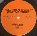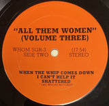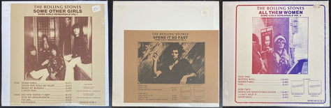 Early 1980s set of 3 LPs of "Some Girls" rehearsals with plain white covers which have purple, blue, and red artist/title stamp on front. Includes one tan, one brown, and one beige title inserts. Discs have custom labels. Two of the discs are sealed ("Some Other Girls" and "Spend It So Fast") while "All Them Women" retains its original shrink wrap. Beautiful unplayed condition. Vintage price stickers attached to shrink on two covers.