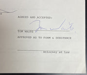 1980 3-page legal letter signed on the second page and initialed on the first and third pages in blue ballpoint by Tom Waits. Includes Rockaway Records LOA.