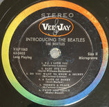 1964 stereo original "version one" LP (with "Love Me Do") and "column back" cover. Rainbow labels with oval VJ logo and "Stereo" at top. Disc labels are nice with some light wear around the perimeter. The cover has some general wear, but NO seam splits. There is a 5" long vertical crease in the back cover slick, which would have happened at the factory. This stereo cover is mega-rare and is 100% genuine. This is the rarest version of Introducing The Beatles, with less than 20 copies known to exist in any condition.