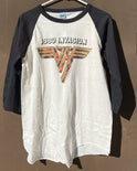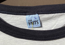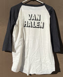 1980 black and white 3/4 sleeve concert t-shirt. The Knit tag states size L, 50/50 cotton/polyester. 19" pit-to-pit, 26" top of collar to hem (at its longest).