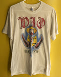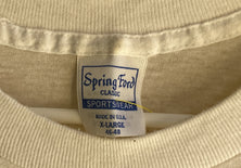 Original 1987 white concert crew t-shirt. Spring Ford tag states size XL, 50/50 cotton/polyester. 20" pit-to-pit, 26" top of collar to hem. Tiny spot on front near left sleeve.