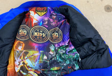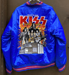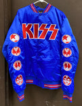2025 blue nylon bomber style jacket with "Kiss" patches on front, huge patch on back and small patches along the sleeves representing each member's character. Tag states size large. 24" pit-to-pit, 30" top of collar to hem, sleeves = 26" shoulder to hem.