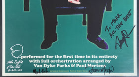 2000 20" x 20" concert poster signed in black marker by Brian Wilson, Tony Asher, artists Mark London and Robert Matheu and in silver marker by Van Dyke Parks, who also drew his customary caricature. Includes Rockaway Records letter of authenticity.